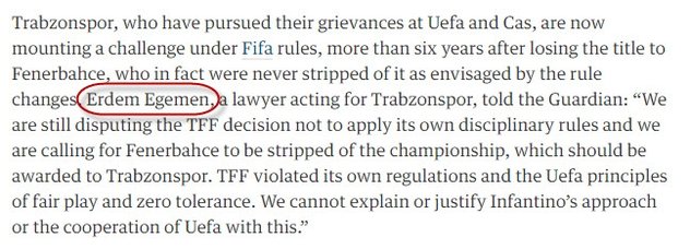 Gündeme bomba gibi düşen haberin ardından The Guardian'a konuşan Trabzonspor avukatı Erdem Egemen; "Biz hala TFF'nin bu konuda kendi disiplin talimatını uygulamadığını iddia ediyor ve 2010-2011 sezonu şampiyonluğunun Fenerbahçe'den alınıp Trabzonspor'a verilmesi gerektiğini düşünüyoruz." ifadelerini kullandı.
