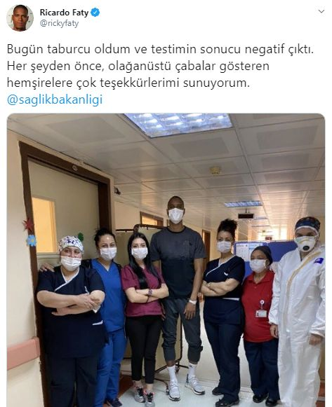 Taburcu olduktan sonra sosyal medya hesabından bir açıklamada bulunan Ricardo Faty, "Bugün taburcu oldum ve testimin sonucu negatif çıktı. Her şeyden önce, olağanüstü çabalar gösteren hemşirelere çok teşekkürlerimi sunuyorum" ifadelerini kullandı.