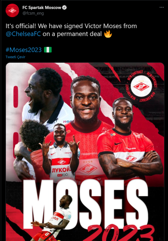 Süper Lig'de 2019-2020 sezonunda Fenerbahçe'de top koşturan Victor Moses, kariyerine Rusya'da devam ediyor... Nijeryalı kanat oyuncusu, geçen sezon kiralık olarak forma giydiği Spartak Moskova ile 2 yıllık sözleşme imzaladı.