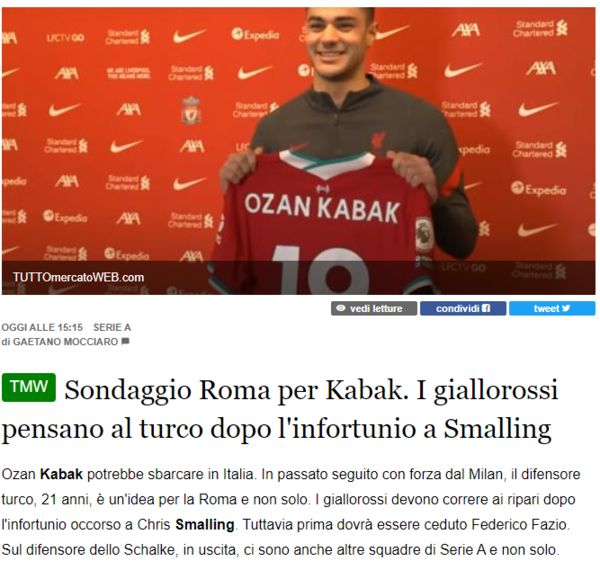 Liverpool'da kiralık olarak forma giymesinin ardından Bundesliga ekiplerinden Schalke 04'e dönen Kabak için Leichester City, Sevilla, Crystal Palace iddiaları ortaya atılırken, bir söylenti de İtalyan medyasından geldi.