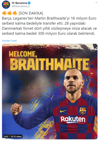 Barcelona, Leganes'ten Martin Braithwaite'yi 18 milyon Euro serbest kalma bedeliyle transfer etti. 28 yaşındaki Danimarkalı forvet dört yıllık sözleşmeye imza atacak ve serbest kalma bedeli 300 milyon Euro olarak belirlendi.