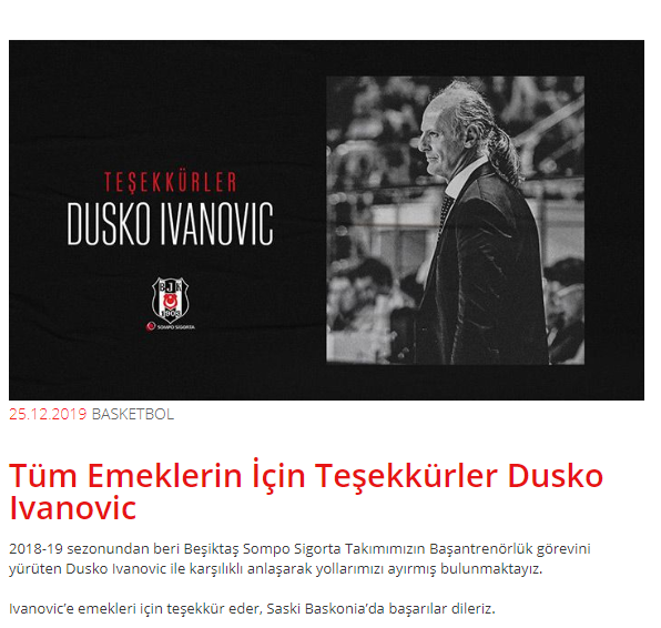 Kulübün internet sitesinden yayımlanan mesajda, "Beşiktaş Sompo Sigorta Takımı'mızın başantrenörlük görevini yürüten Dusko Ivanovic ile karşılıklı anlaşarak yollarımızı ayırmış bulunmaktayız. Ivanovic'e emekleri için teşekkür eder, Baskonia'da başarılar dileriz." denildi.