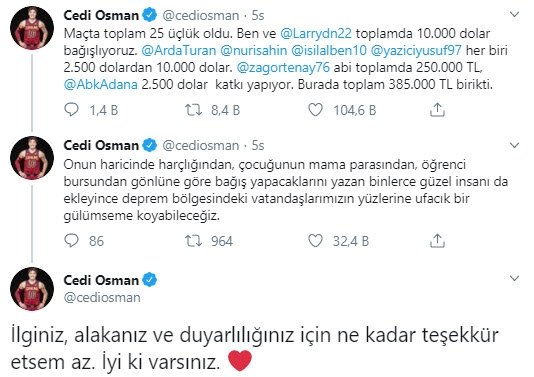 NBA takımlarından Cleveland Cavaliers forması giyen Cedi Osman, Elazığ'da yaşanılan deprem sonrasında, depremzedelerin yaralarını sarabilmesi için yardım kampanyası başlatmıştı. Milli gururumuz, Cleveland Cavaliers - Chicago mücadelesinde atılan her 3 sayı için 100 dolar bağışta bulunacağını açıklamıştı.