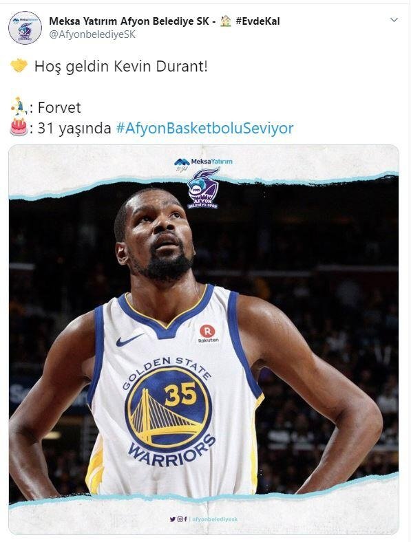 ING Basketbol Süper Ligi ekiplerinden Meksa Yatırım Afyon Belediyespor, Kevin Durant'i kadrosuna kattığını açıkladı.