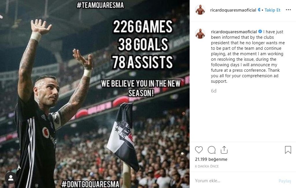 Beşiktaş forması giyen Portekizli yıldız Ricardo Quaresma, Instagram hesabı üzerinden çok konuşulacak açıklamalara imzasını attı.