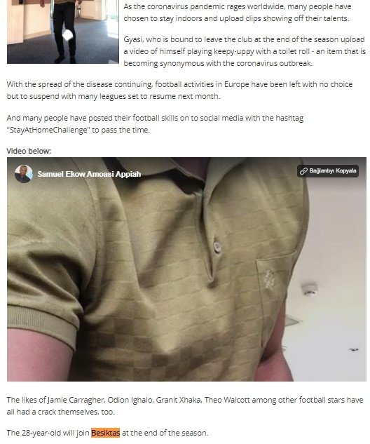Gyasi'nin, şu anda futbolcuların koronavirüse duyarlılık kazanılması amacıyla paylaştığı ve tuvalet rulosu sektirdiği "Stay At Home Challenge" için çektiği video paylaşıldı.