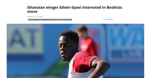 Beşiktaş'ta flaş transfer gelişmesi... Gana basınında yer alan habere göre, gelecek sezon siyah beyazlı formayı giymesine neredeyse kesin gözüyle bakılan ancak corona virüsü (koronavirüsü) nedeniyle şu anda görüşmeleri askıya alınan Edwin Gyasi, siyah beyazlı kulüple alakalı açıklamalarda bulundu.