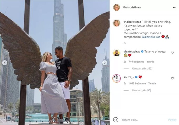Siyah beyazlıların çok istediği yıldız isim Alex Teixeira, transfer görüşmeleri için Dubai'ye gitti. Brezilyalı yıldız ve eşi, Dubai'den sık sık paylaşım yapıyor. Teixeira gibi eşi Cristina da büyük ilgi gördü. Cristina'nın 10 saat içinde paylaştığı fotoğrafa akılalmaz sayıda yorum yağdı.
