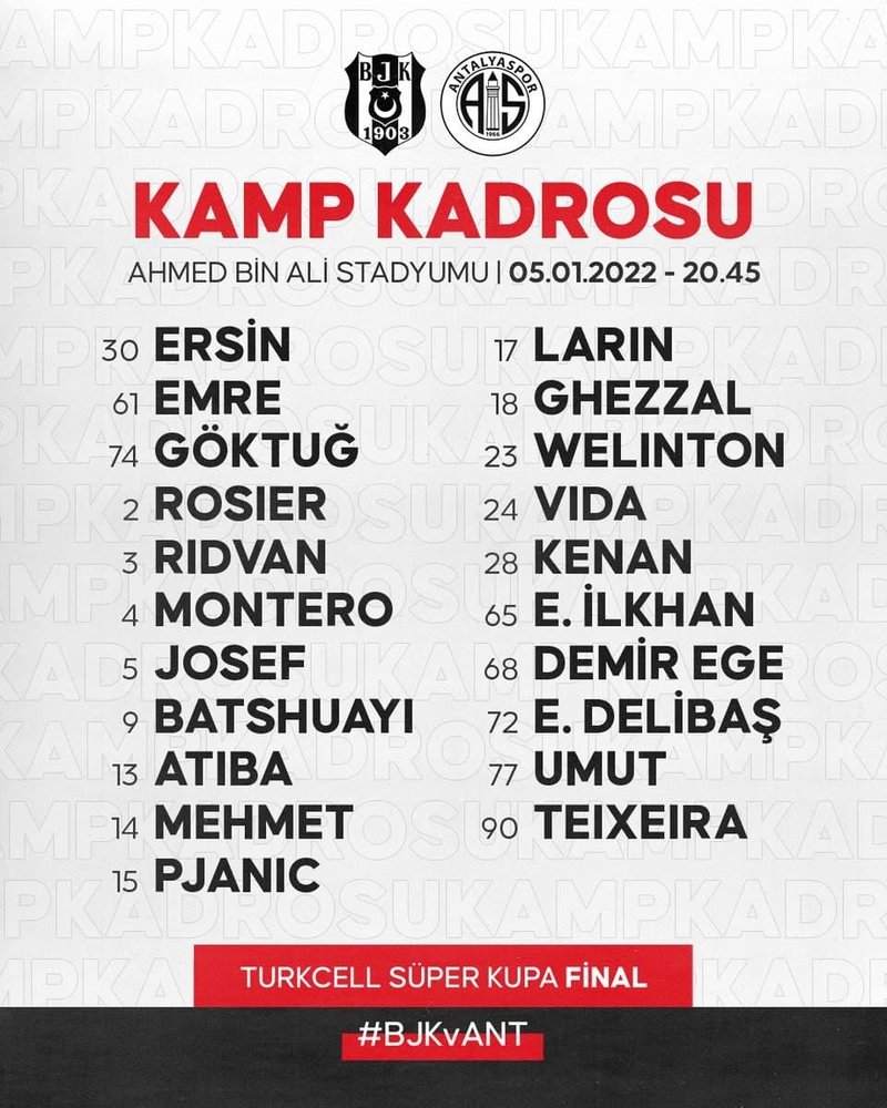 Beşiktaş'ın kamp kadrosu ise şu isimlerden oluştu;