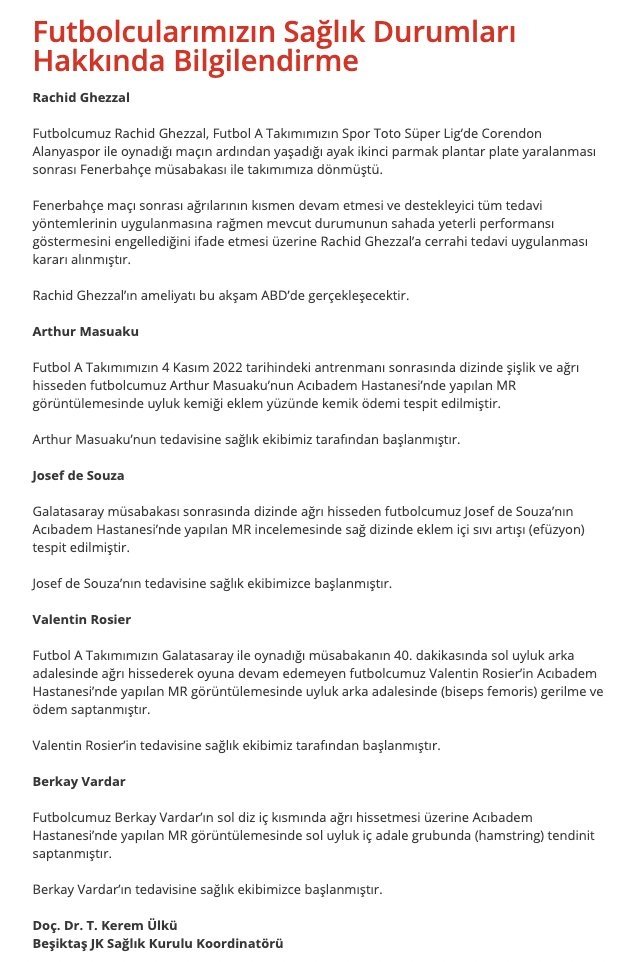 Süper Lig'in 13. haftasında Galatasaray ile derbi maçına çıkan ve sahadan 2-1 mağlup ayrılan Beşiktaş'ta, 5 futbolcudan kötü haber geldi. Siyah beyazlılar, Ghezzal, Josef, Rosier, Masuaku ve Berkay Vardar ile ilgili sakatlık açıklaması yaptı.