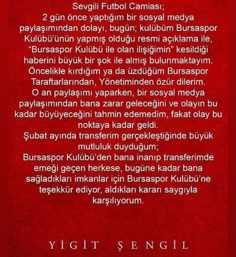 Bursaspor altyapısında forma giyen 16 yaşındaki futbolcu Yiğit Şengil, Beşiktaş'la ilgili bir paylaşım yapması üzerine Bursaspor'dan gönderildi.