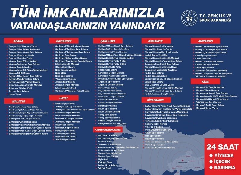 Gençlik ve Spor Bakanı Dr. Mehmet Muharrem Kasapoğlu, depremzedeler için sıcak yemek, içecek ve barınma hizmeti verilen adresleri sosyal medya hesabından paylaştı.
