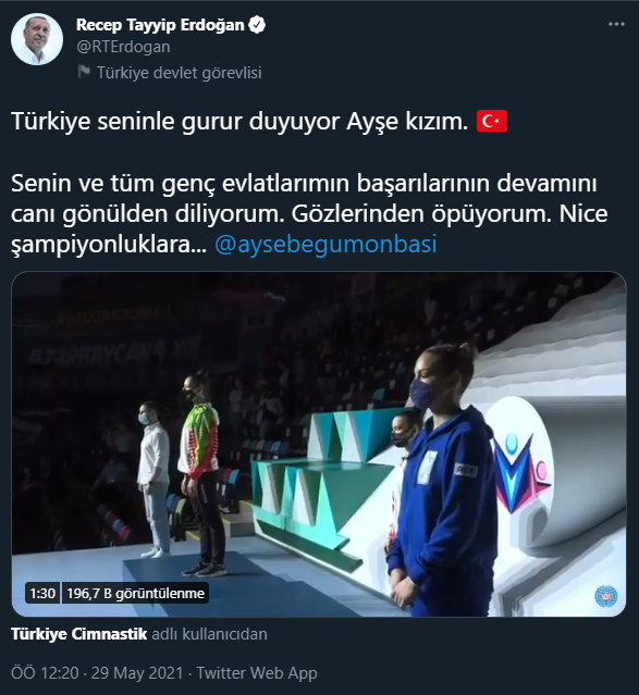 Başkan Recep Tayyip Erdoğan, Twitter hesabından yaptığı paylaşımda, "Türkiye seninle gurur duyuyor Ayşe kızım.