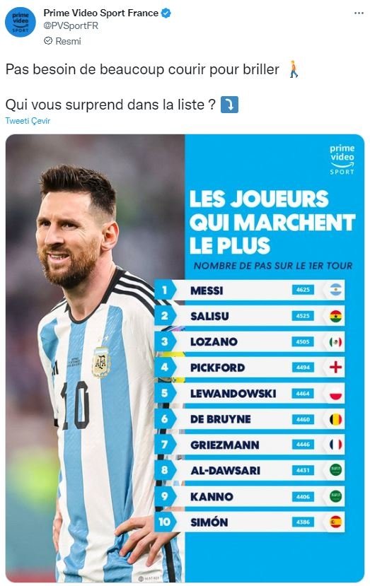 Arjantin'in yıldız ismi Lionel Messi, turnuvanın ilk turdaki maçları göz önüne alındığında ilginç bir istatistiğe imzasını attı. Prime Video'nun paylaştığı bilgilere göre Messi attığı 4 bin 625 adımla, ilk turda sahada en çok yürüyen oyuncu oldu. Messi'yi 4 bin 525 adımla Ganalı Salisu ve 4 bin 505 adımla Meksikalı Lozano izledi.