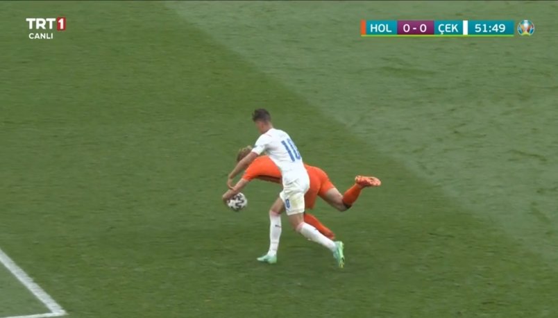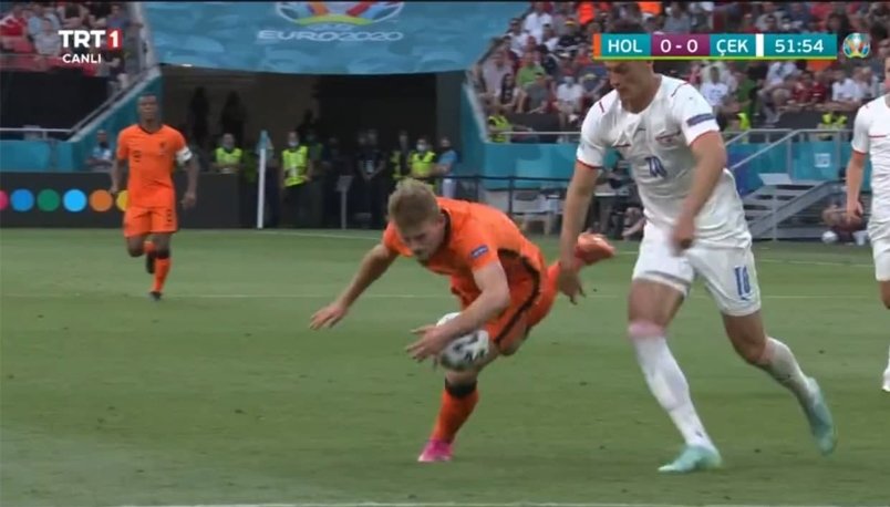Defansın arkasına hareketlenen Patrik Schick, rakibinden sıyrılıp kaleci ile karşı karşıya kalmak isterken, Hollanda'nın yıldızı Matthijs de Ligt topu eliyle önüne aldı.