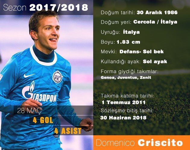 2011'den bu yana Zenit forması giyen Domenico Cristico, teknik direktör Roberto Mancini'nin vazgeçilmezleri arasında yer alıyor… İtalyan çalıştırıcı, bu sezon Rusya Premier Lig'de vatandaşına 20 maçın tamamında 11'de görev verdi. Criscito tüm karşılaşmalarda 90 dakikada görev yaptı.(Sabah)