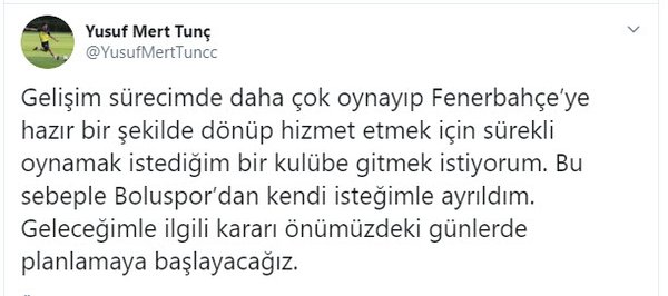 Sezon başında TFF 1. Lig ekibi Boluspor'a kiralanan 19 yaşındaki Yusuf Mert Tunç kendisine ait sosyal medya hesabından yaptığı açıklamada, Ocak ayına kadar Fenerbahçe'de antrenmanlarına devam edeceğini açıkladı.