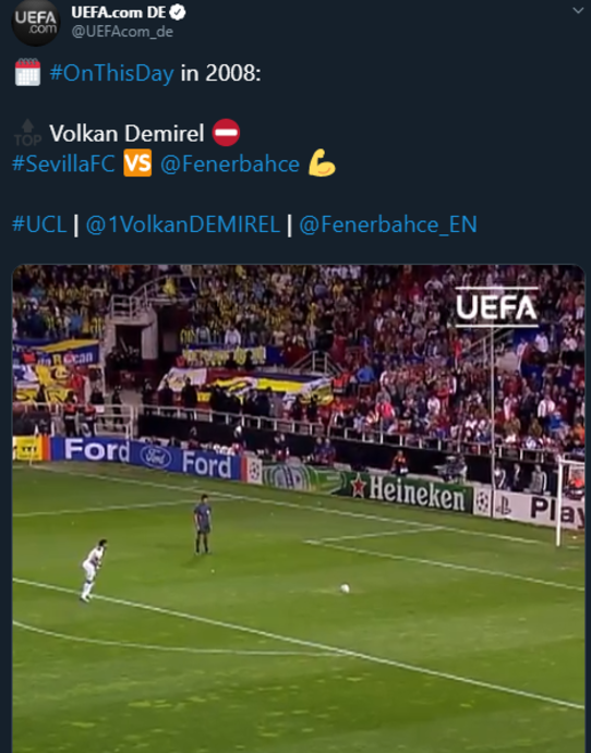 UEFA, Fenerbahçe'nin 12 yıl önce Sevilla'yı penaltı atışları ile mağlup ettiği maçta Volkan Demirel'in kurtardığı penaltıyı paylaştı. Deneyimli file bekçisi, Sevilla forması giyen Dani Alves'in kullandığı penaltıyı kurtarmış ve sarı lacivertli ekip Şampiyonlar Ligi'nde çeyrek finale yükselmişti. Söz konusu paylaşım, sosyal medyada Fenerbahçe taraftarları tarafından büyük ilgi gördü.