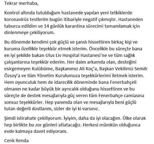 Fenerbahçe Beko İdari Menajeri Cenk Renda, coronavirüsü testlerinin negatif çıktığını açıkladı. Renda, 14 günlük karantina sürecinin tamamlamak için dinlenmeye çekileceğini ifade etti.