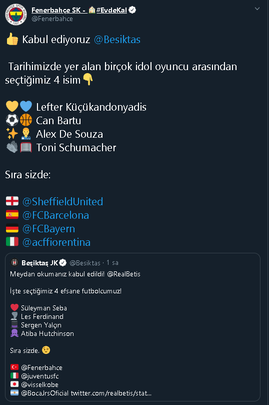 Beşiktaş'ın meydan okumasına cevap veren Fenerbahçe, Lefter Küçükandonyadis, Can Bartu, Alex de Souza ve Toni Schumacher'i efsaneleri arasında gösterdi. Sarı-lacivertliler de paylaşımının altına Sheffield United, Bayern Münih, Barcelona ve Fiorentina'yı etiketleyerek bu kulüplere meydan okudu. İki ezeli rakip arasındaki bu meydan okuma binlerce beğeni aldı.