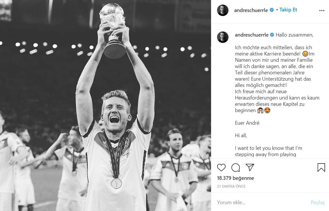 Geçtiğimiz günlerde Borussia Dortmund ile yollarını ayıran Alman futbolcu Andre Schürrle, aktif futbol yaşantısına nokta koyduğunu duyurdu.