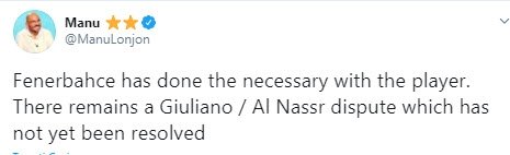 Fenerbahçe'nin Giuliano'nun transferiyle ilgili gerekeni yaptığının altını çizen Manu Lonjon, Brezilyalı yıldızın şu aşamada kulübü Al Nasr ile anlaşmazlık yaşadığını belirtti.