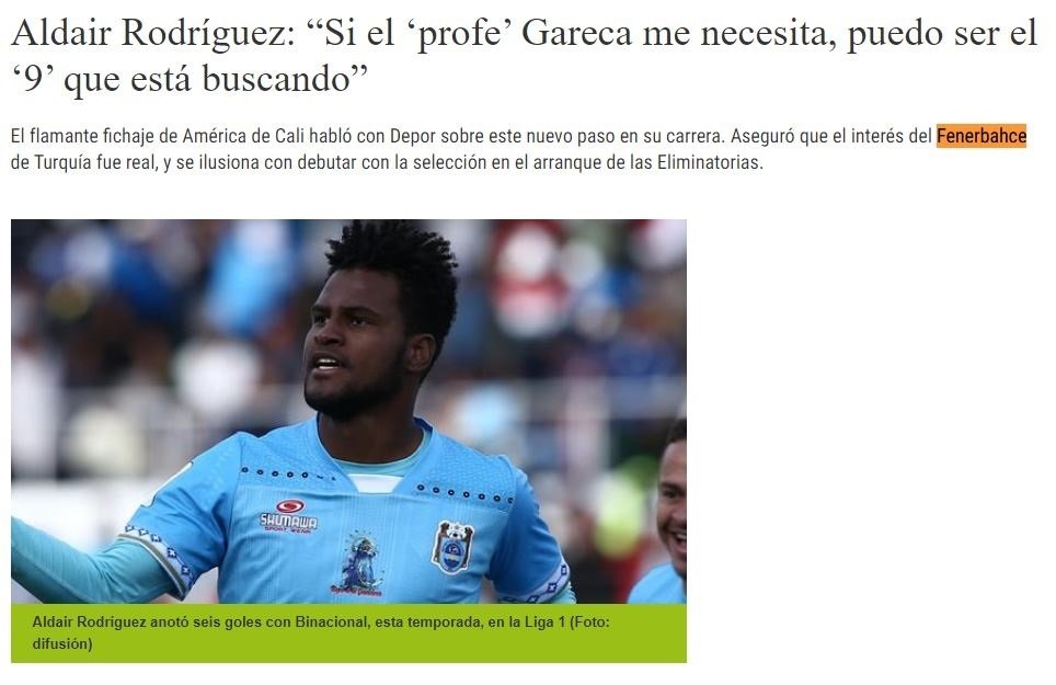Kadrosuna golcü takviyesi yapmak isteyen Fenerbahçe, bir süredir Deportivo Binacional forması giyen Perulu golcü Aldair Rodriguez ile ilgileniyordu. Yıldız futbolcu da daha önce verdiği röportajlarında, sarı-lacivertli takımın kendisi ile ilgilendiği yönündeki iddiaları doğrulamıştı.