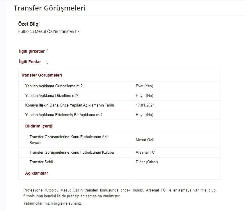 Profesyonel futbolcu Mesut Özil'in transferi konusunda önceki kulübü Arsenal FC ile anlaşmaya varılmış olup, futbolcunun kendisi ile de prensip anlaşmasına varılmıştır.