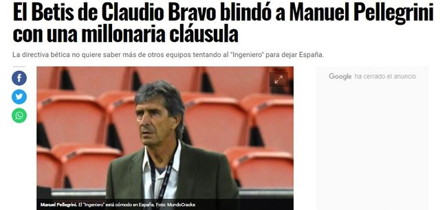 Encancha'da yer alan habere göre Real Betis, Manuel Pellegrini'nin sözleşmesine satın alma bedeli koydu ve usta teknik adam, Betis'ten ayrılmaya kara vermesi halinde, yeni takımı 4.5 milyon euro ödemek zorunda bırakılacak.