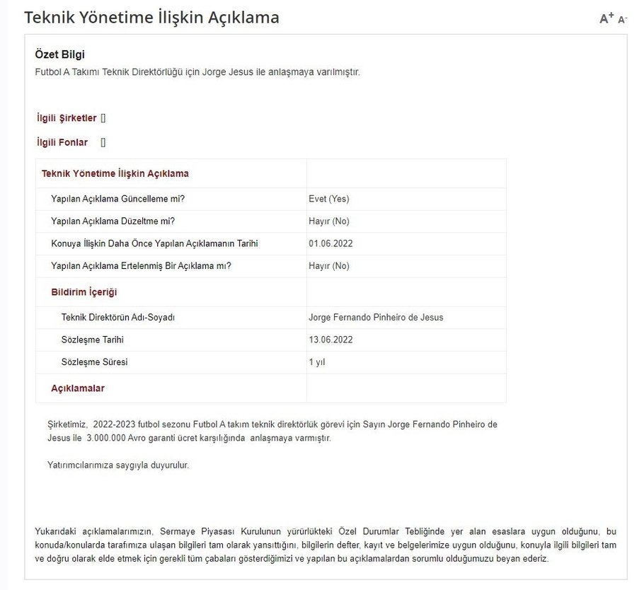 Şirketimiz, 2022-2023 futbol sezonu Futbol A takım teknik direktörlük görevi için Sayın Jorge Fernando Pinheiro de Jesus ile 3.000.000 Avro garanti ücret karşılığında anlaşmaya varmıştır.
