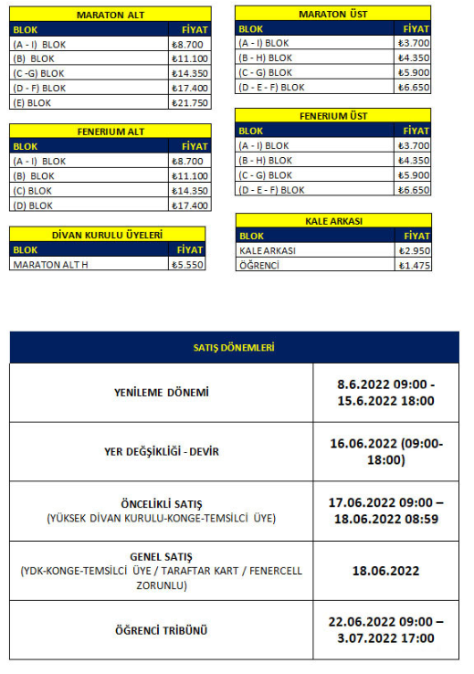 Fenerbahçe Kulübü, 2022-2023 sezonu kombine fiyatlarını açıkladı. Kombine 1475 ile 21750 lira arasında değilen fiyatlarla 8 Haziran Çarşamba günü satışa çıkarılacak.