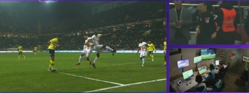 Alexander Djiku'nun ceza sahası içinde kafayla çevirdiği topun Kayserisporlu futbolcunun eline çarpması sonrası hakem Zorbay Küçük, VAR'a çağrıldı. Monitörden pozisyonu inceleyen Zorbay Küçük beyaz noktayı gösterdi.