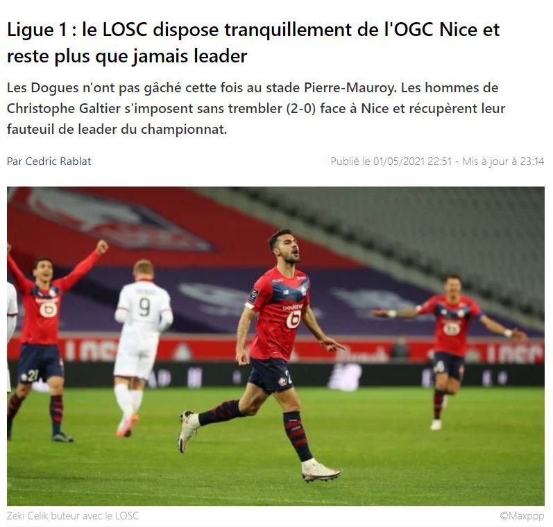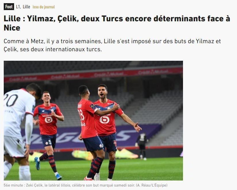 Spor gazetesi L'Equipe'in "Lille: Yılmaz ve Çelik, Nice'e karşı yine 2 kararlı Türk" başlıklı haberinde, Lille'in 3 hafta önce Metz karşılaşmasında olduğu gibi Nice'i Burak Yılmaz ve Zeki Çelik'in golleriyle yendiği belirtildi. Haberde, 2 oyuncunun dünkü maçta etkili performans sergiledikleri vurgulandı. Burak'ın rakiplerine karşı "zehir" gibi olduğunun ifade edildiği haberde, Zeki Çelik'in de sağ bekte "hiperaktif" ve etkili olduğu kaydedildi.