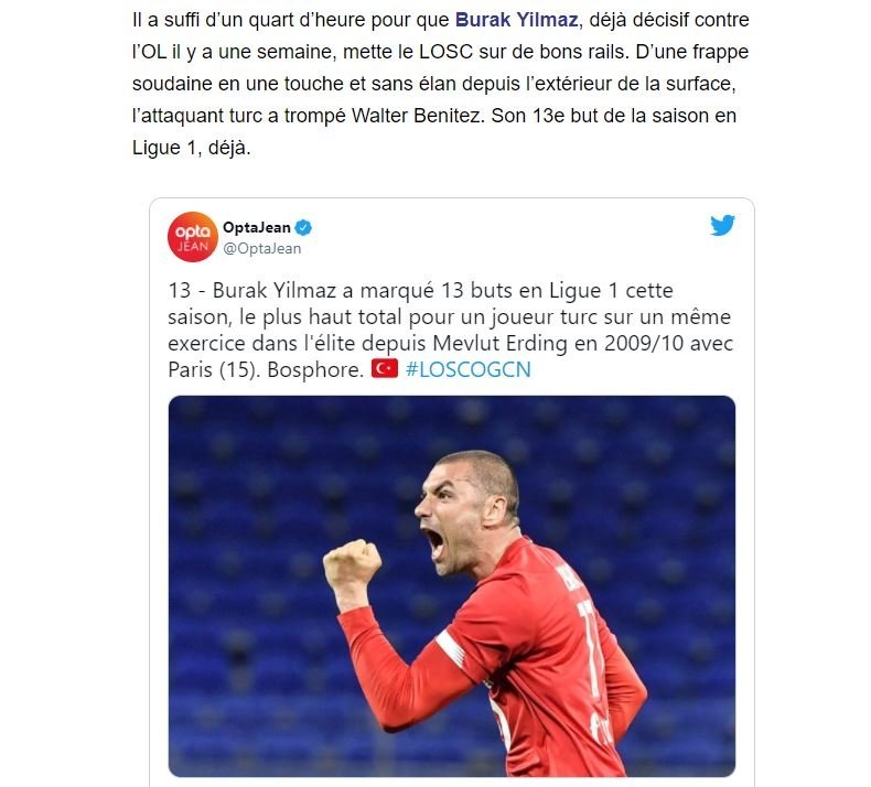RMC Sport kanalının haberinde, Lille'i galibiyete ulaştırmak için Burak Yılmaz'a 15 dakikanın yeterli geldiği kaydedildi.