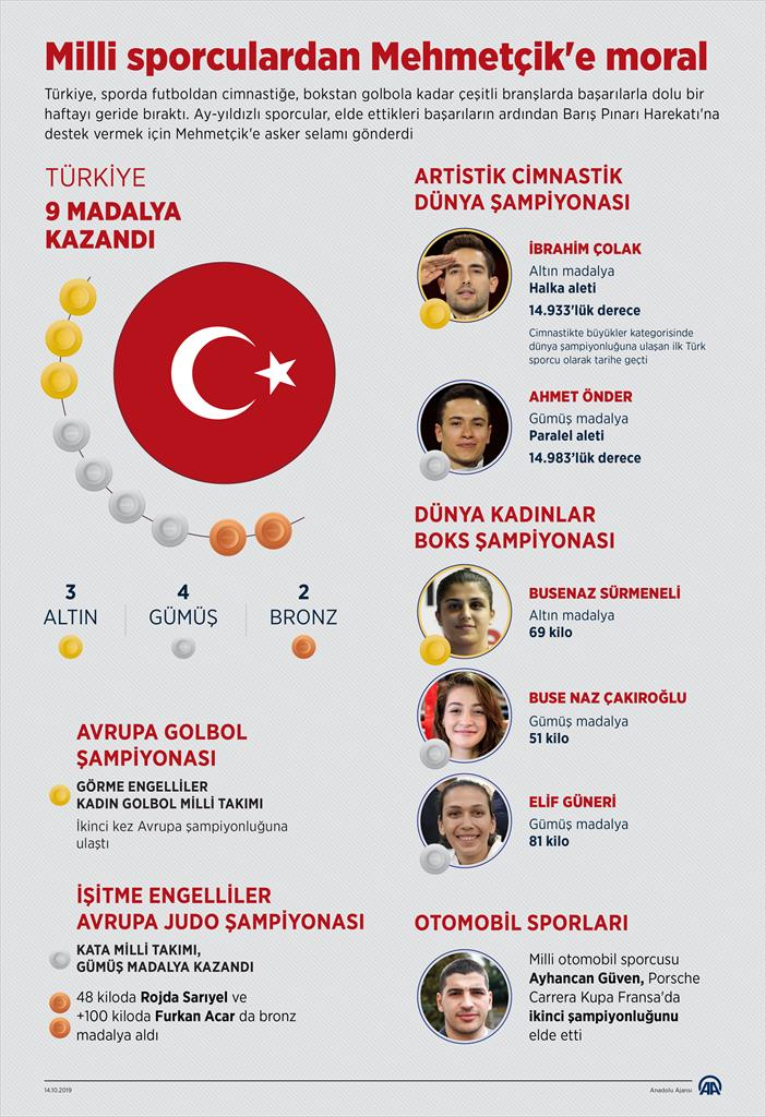 Türkiye, sporda futboldan cimnastiğe, bokstan golbola kadar çeşitli branşlarda başarılarla dolu bir haftayı geride bıraktı.Milli sporcuların uluslararası arenada elde ettiği başarılar, Türkiye'nin güney sınırında oluşturulmaya çalışılan terör koridorunu yok etmek, bölgeye barış ve huzuru getirmek amacıyla "Barış Pınarı Harekatı"nı yürüten Mehmetçik için de büyük moral oldu.