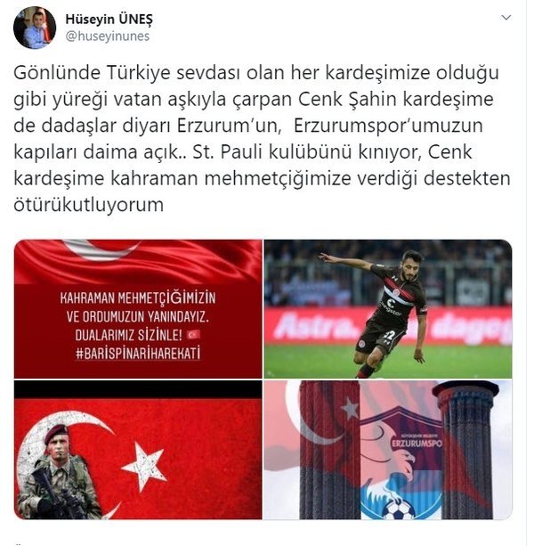 Hüseyin Üneş, Cenk Şahin için yaptığı paylaşımda, "Gönlünde Türkiye sevdası olan her kardeşimize olduğu gibi yüreği vatan aşkıyla çarpan Cenk Şahin kardeşime de dadaşlar diyarı Erzurum'un, Erzurumspor'un kapıları daima açık.. St. Pauli kulübünü kınıyor, Cenk kardeşime kahraman Mehmetçik'imize verdiği destekten ötürü kutluyorum." ifadelerini kullanmıştı.