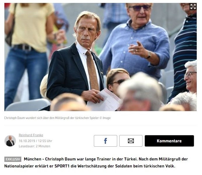 Bir dönem ülkemizde Fenerbahçe, Beşiktaş ve Bursaspor'un teknik direktörlüğünü yapan Christoph Daum, Alman basınından Sport 1'e A Milli Takım futbolcularının maçlarda yaptığı asker selamı ile ilgili röportaj verdi.
