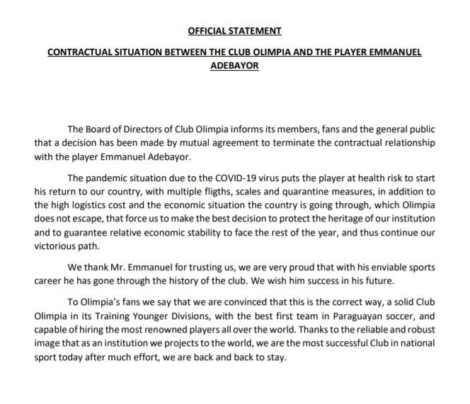 Togolu golcü Emmanuel Adebayor'un Olimpia macerası kısa sürdü. Corona virüsü sebebiyle ülkesine giden yıldız futbolcu, sağlık riskleri nedeniyle Paraguay'a dönemedi. Kulübü ile temasa geçen tecrübeli futbolcunun karşılıklı olarak sözleşmesinin sona erdirilmesine karar verildi.