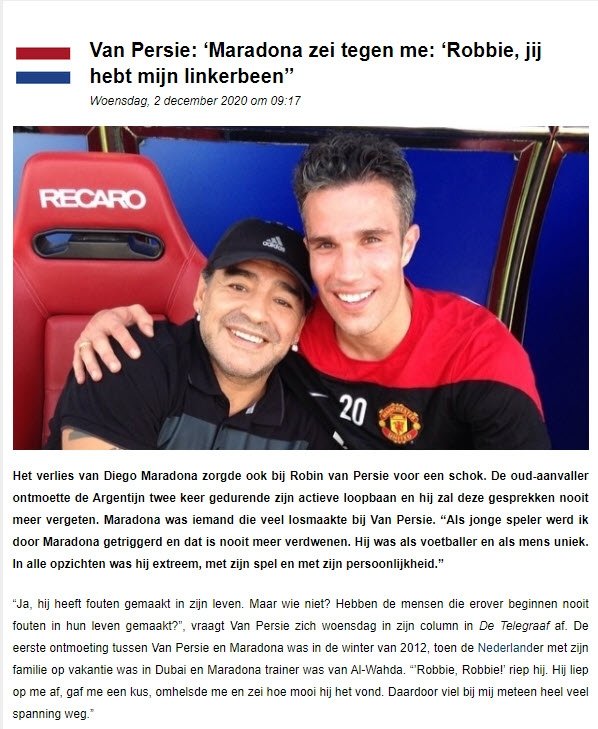 Maradona ile Dubai'de yaşadığı bir anıyı paylaşan van Persie, "Maradona ile Dubai'de tesadüf eseri karşılaşmıştık. Tercümanı aracılığıyla harika bir sohbet başladı. Sonra konu sol bacağıma geldi. Maradona, ikimizinde özel bir sol bacağı olduğunu söyledi ve sol bacağıma bir öpücük kondurdu." dedi.