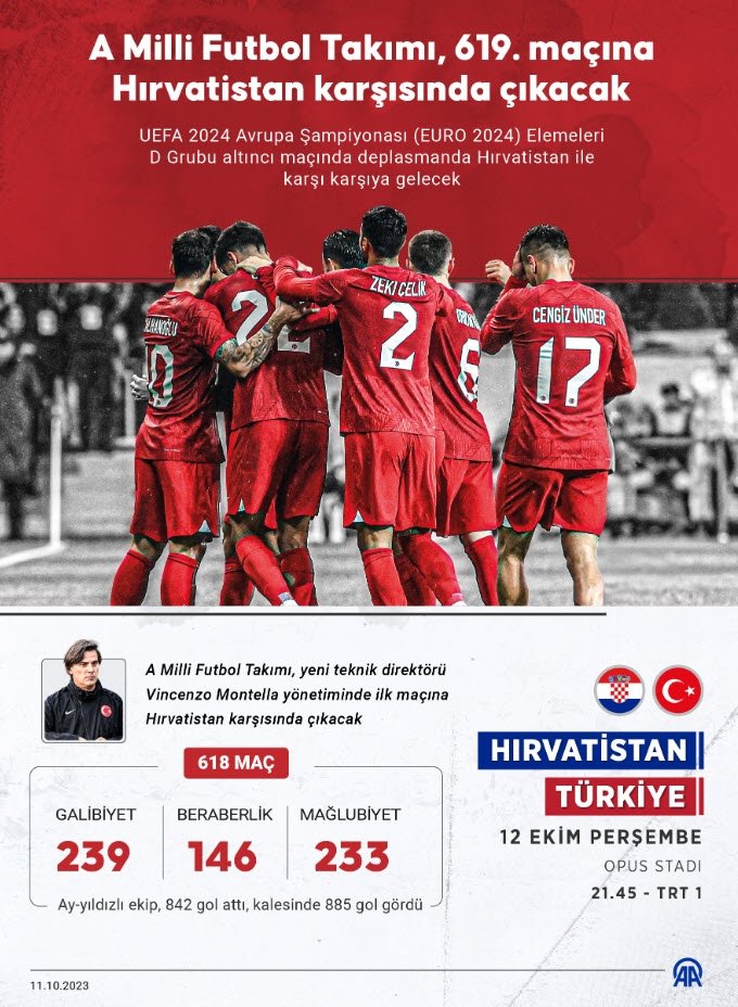A Milli Futbol Takımı'mız, Hırvatistan karşısında kritik bir müsbakaya çıkacak. Stefan Kuntz ile yolları ayıran Türkiye, İtalyan Teknik Direktör, Vincenzo Montella'yı takımın başına getirdi. Montella, Türkiye A Milli Futbol Takımı teknik direktörü olarak ilk maçına Hırvatistan karşısında çıkacak. Montella'nın ikinci sınavı ise 15 Ekim'de Letonya karşısında olacak.