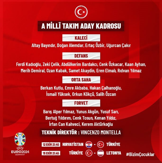 A Milli Futbol Takımı'nın Hırvatistan ve Letonya ile yapacağı maçların aday kadrosunda şu futbolcular bulunuyor: