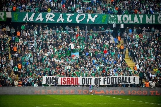 UEFA ve FIFA'ya İsrail takımlarının futboldan men edilmesi çağrısında bulunan yeşil-beyazlı taraftarların yer aldığı tribünde "Kick Israel out of football" (İsrail'i futboldan atın) yazılı pankart açıldı.