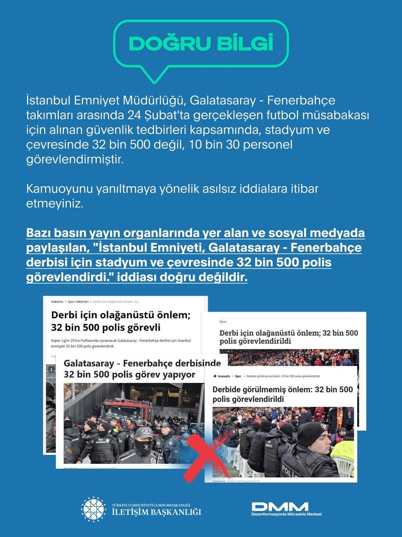 Dezenformasyonla Mücadele Merkezi'nin açıklamasında, İstanbul Emniyet Müdürlüğü'nün Galatasaray-Fenerbahçe karşılaşması için stadyum ve çevresinde toplam 10 bin 30 personel görevlendirdiği belirtildi. Açıklamada, 32 bin 500 polis görevlendirme iddiasının doğru olmadığı vurgulandı.