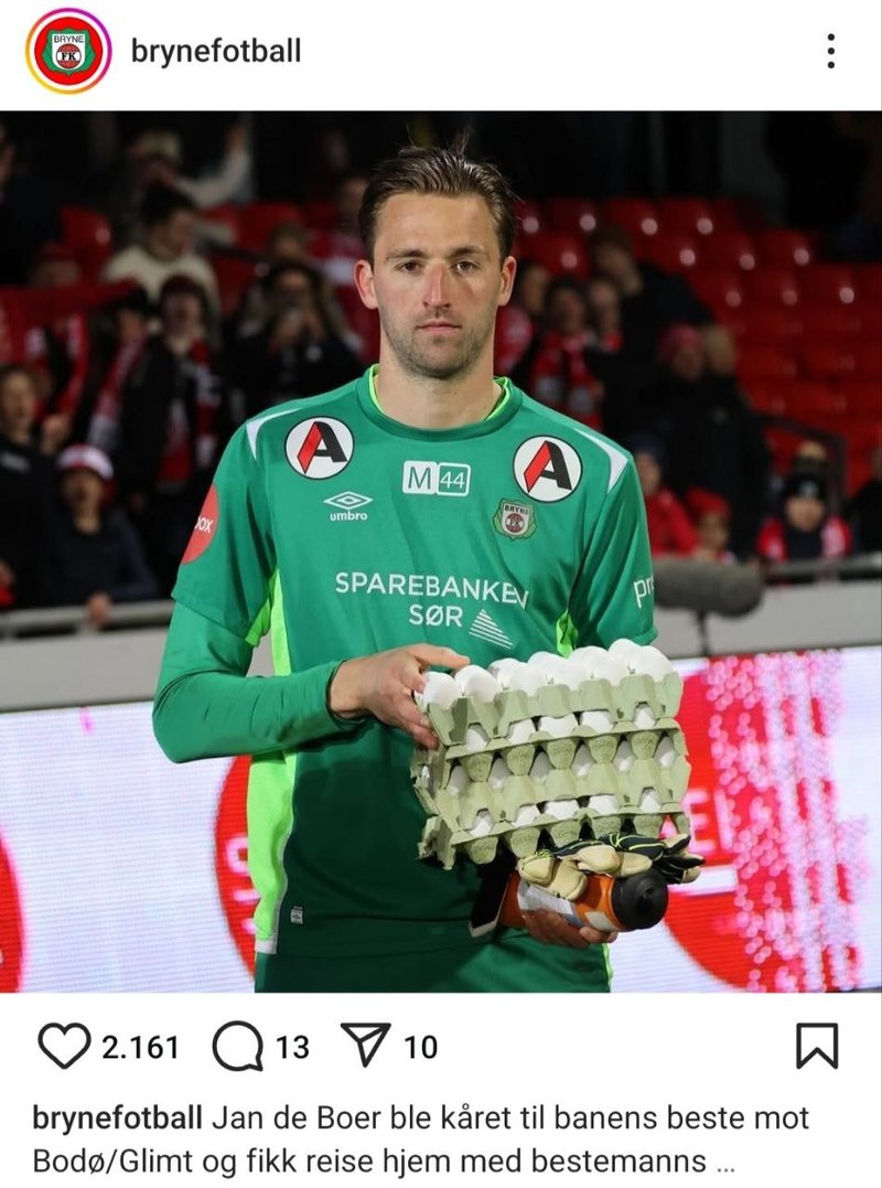 Bryne FK'nin kalecisi Jan de Boer, takımı 1-0 mağlup olmasına rağmen gösterdiği performansla maçın en iyi oyuncusu seçildi. Hollandalı kaleciye ödül olarak 4 koli yumurta verildi. Bryne FK bu anı sosyal medya hesabından paylaşarak, "Jan de Boer, Bodo Glimt karşısında sahada en iyisi seçildi ve bu maçta sponsorumuzdan gelen 4 koli yumurtayla ödüllendirildi." notunu düştü.
