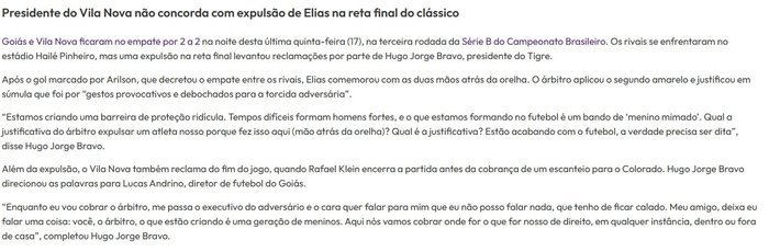 Karşılaşmanın ardından Vila Nova kulübünün başkanı Hugo Jorge Bravo bu karara itiraz ederken "Gülünç bir koruma bariyeri yaratıyoruz. Zor zamanlar güçlü adamlar yaratır ve futbolda oluşturduğumuz şey bir grup 'şımarık velet'. Hakemin oyuncularımızdan birini bunu yaptığı için (kulağının arkasına elini koyduğu için) oyundan atmasının gerekçesi nedir? Gerekçe nedir? Futbolu mahvediyorlar, gerçeğin söylenmesi gerekiyor" ifadelerini kullandı.