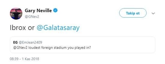 Twitter'dan kendisine gelen soruları cevaplayan Neville, ''Kariyerinde yurtdışında gördüğün en gürültülü stat neresiydi?'' sorusuna Galatasaray ve Glasgow Rangers cevabı verdi.