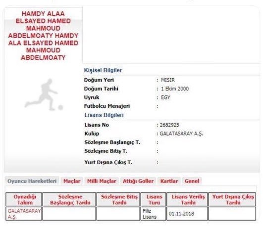 Galatasaray ilk transferini yaptı. Sarı kırmızılı ekip 18 yaşındaki Mısırlı genç oyuncu Hamdy Alaa Elsayed Hamed Mahmoud Abdelmoaty'e resmen lisans çıkardı.