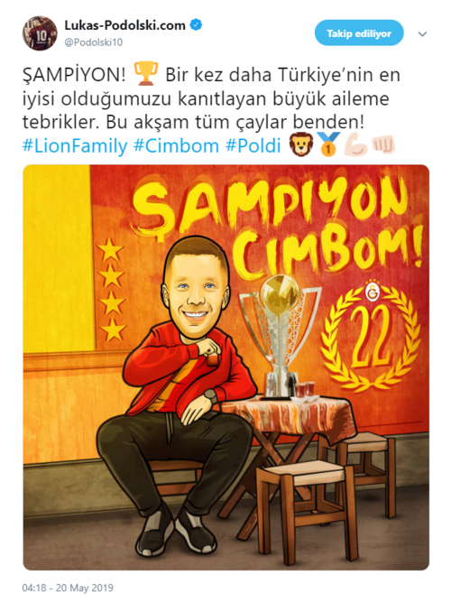Dakikalar içinde yüzlerce beğeni ve retweet alan paylaşımda Türkiye'deyken çaya olan tutkusuyla bilinen Poldi 'Şampiyon! Bir kez daha Türkiye'nin en iyisi olduğumuzu kanıtlayan büyük aileme tebrikler. Bu akşam tüm çaylar benden!' yazarak şampiyonluk sevincini paylaştı.