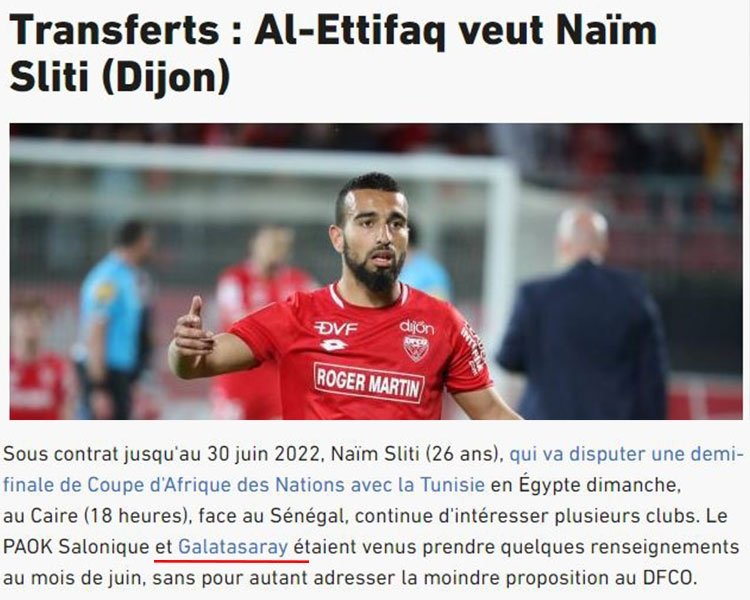 L'Equipe'te yer alan habere göre Galatasaray ve Paok'un kadrosuna katmak istediği 26 yaşındaki sağ kanat oyuncusu için Suudi Arabistan'ın Al Ittifak kulübü 2.7 milyon Euro'luk bir teklif yaptı. Haberin detayında Dijon Başkanı Olivier Delcourt'un 2018 yılında Lille'den 2 milyon Euro'ya transfer ettiği Sliti'yi bu rakama göndermeye sıcak bakmadığı bildirildi.
