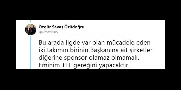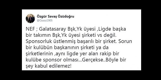Özüdoğru, konuyla ilgili olarak şunları da ekledi: "NEF ; Galatasaray Bşk,Yk üyesi ,Ligde başka bir takımın Bşk,Yk üyesi şirketi vs değil. Sponsorluk üstlenmiş başarılı bir şirket. Sorun bir kulübün başkanının şirketi ya da şirketlerinin ,aynı ligde yer alan rakip bir kulübe sponsor olması...Gerçekse..Böyle bir şey kabul edilemez!"